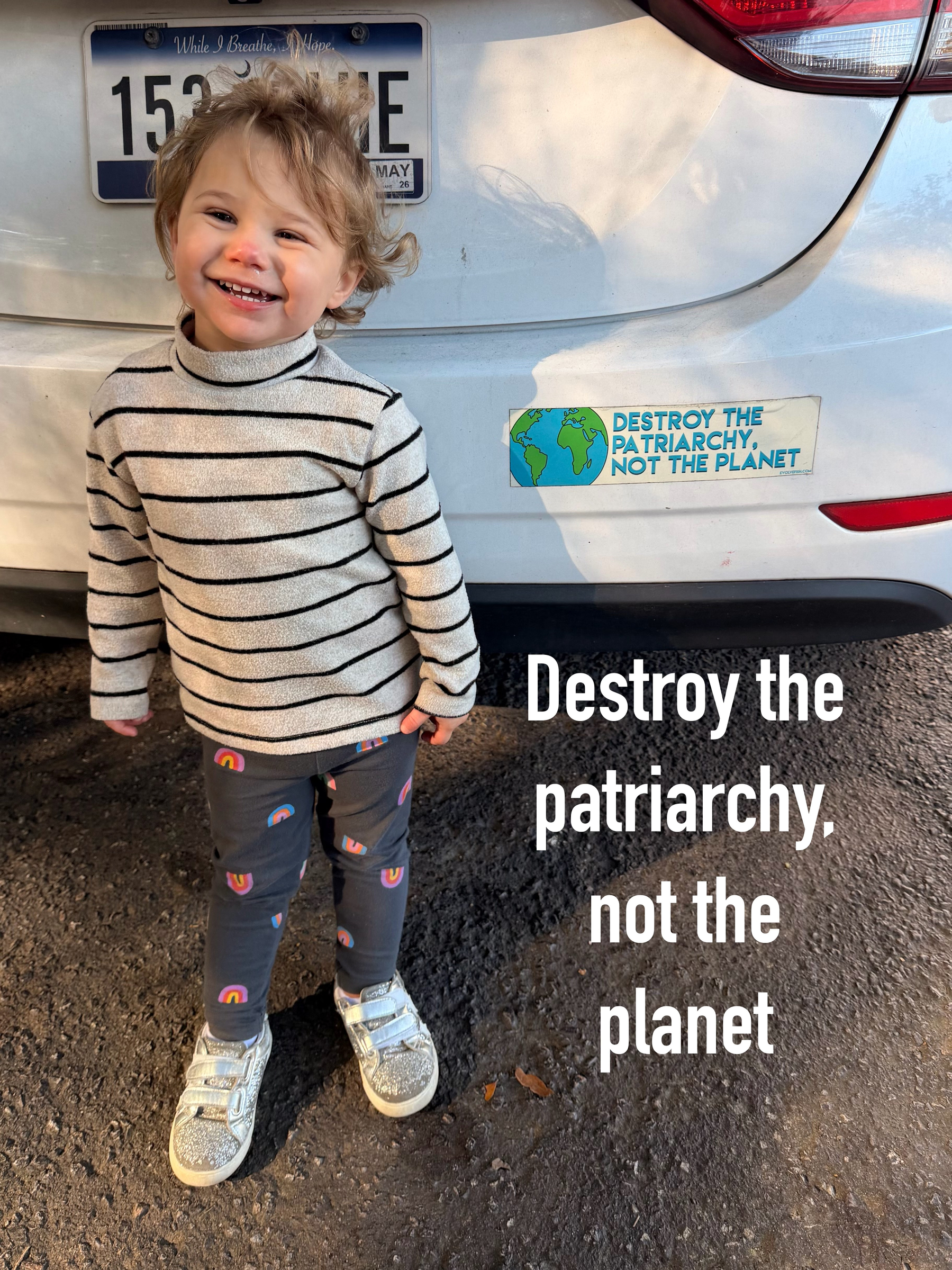 #The last 24 hours have been full of delightful reminders about the value of inclusiveness and our shared humanity. Yesterday morning, my daughter went up to this bumper sticker and asked about it. As the father to a young girl, it delighted me that she already noticed a message about smashing the patriarchy. I want her to grow up in a society where women feel fully equal to men. That also means men letting go of false feelings of being “hurt” by women asserting themselves. Watching women claim their rights as humans doesn’t make me feel less powerful as a man. I feel best when everyone feels fully human.